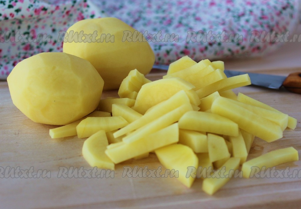 После того как белые грибы проварятся с момента закипания 15 минут, добавить к ним очищенный и нарезанный на брусочки картофель, снова дать закипеть, посолить и уменьшить огонь. Варить суп до готовности картошки (минут 15)