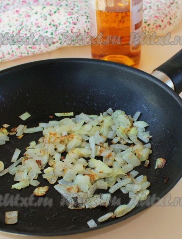 Разогреть на сковороде растительное масло, выложить нарезанный лук и обжарить его, помешивая, в течение 3-4 минут (до мягкости) на среднем огне.