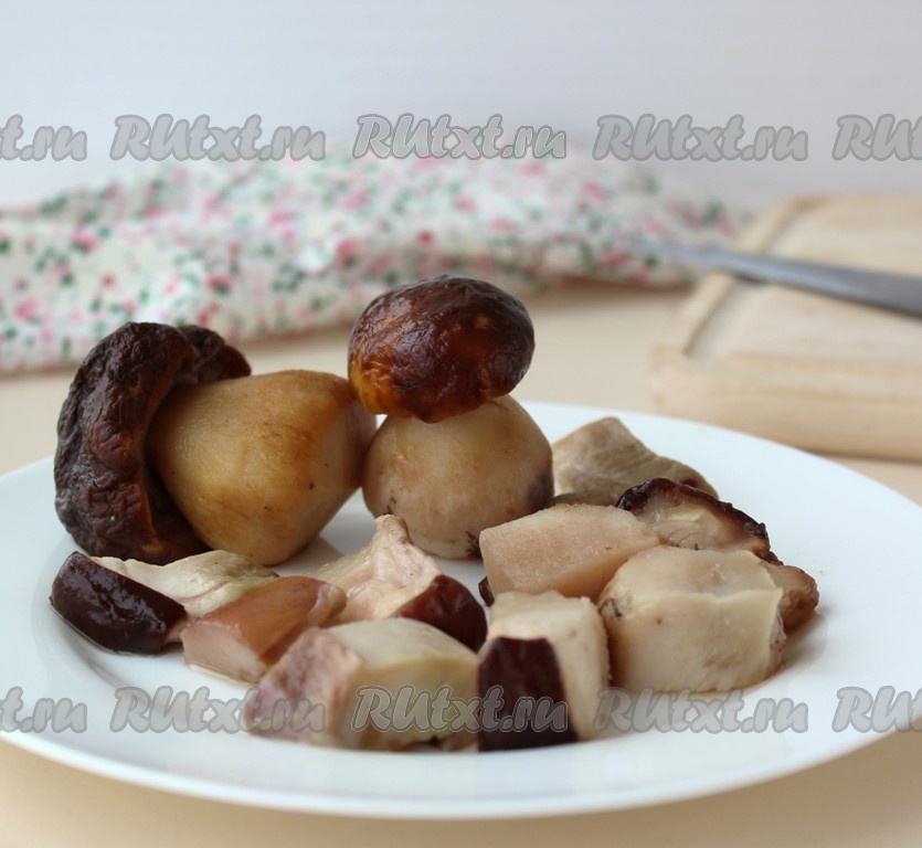 Белые грибы перед замораживанием я не отвариваю, просто тщательно промываю их водой и замораживаю. Если грибочки были заморожены целиком, перед приготовлением супа их нужно немного разморозить, нарезать на кусочки. В кастрюлю влить 2-2,5 литра чистой холодной воды, выложить белые грибы, поставить на огонь, с момента закипания варить на небольшом огне в течение 15 минут.