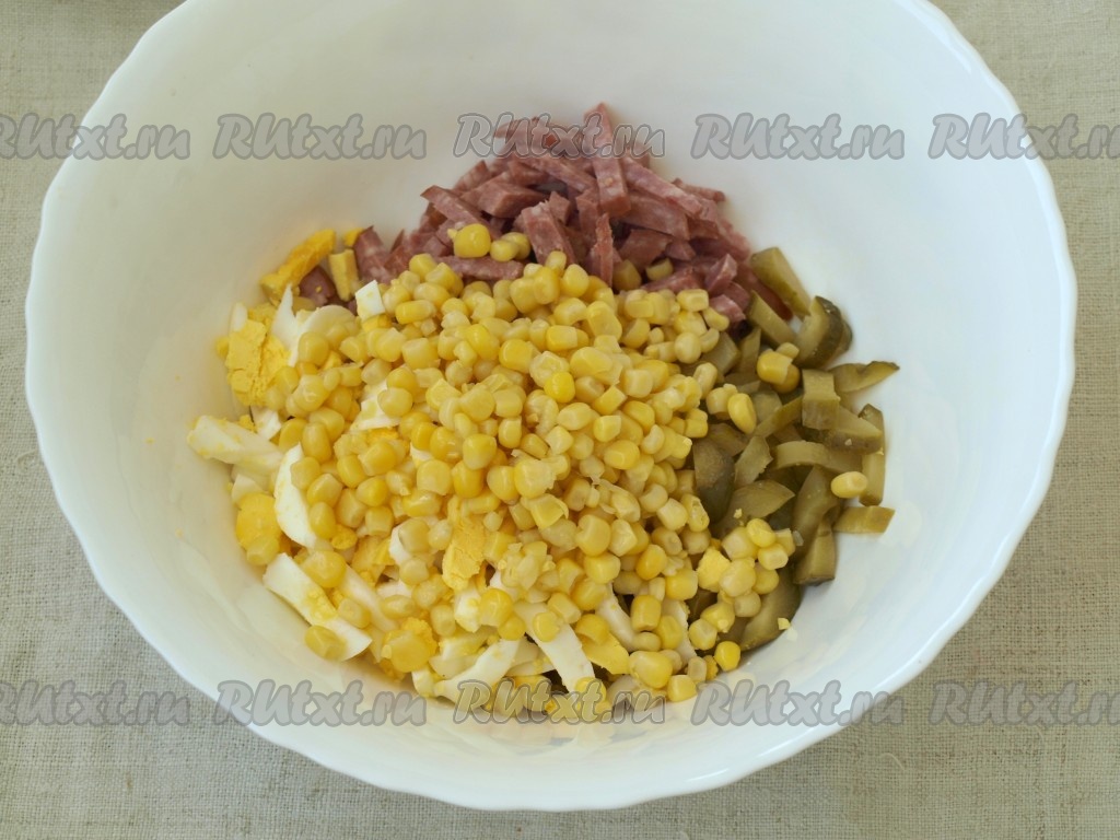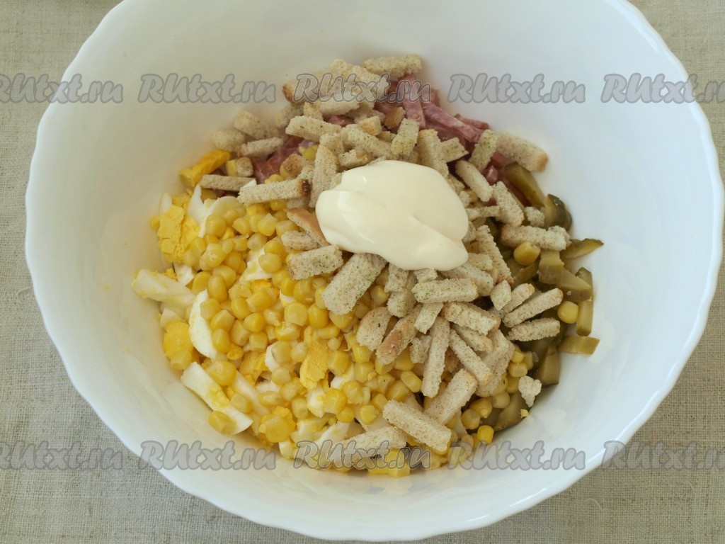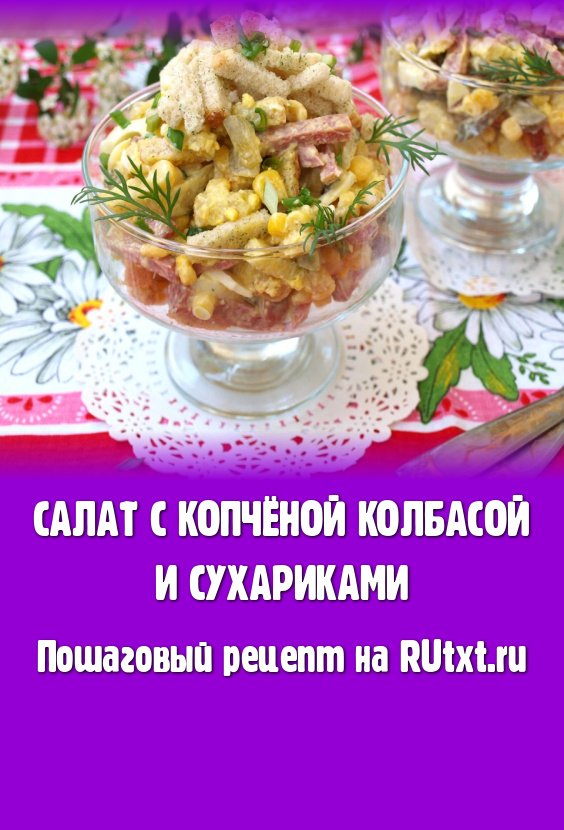Предлагаю вам вкусный закусочный салат с копчёной колбасой и сухариками. Для сочности в него добавляется маринованный огурец и консервированная кукуруза, а яйца хорошо дополняют этот салат. Блюдо быстро готовится, поэтому подойдёт для повседневной кухни, но в порционных креманках его вполне можно подать на праздничный стол.