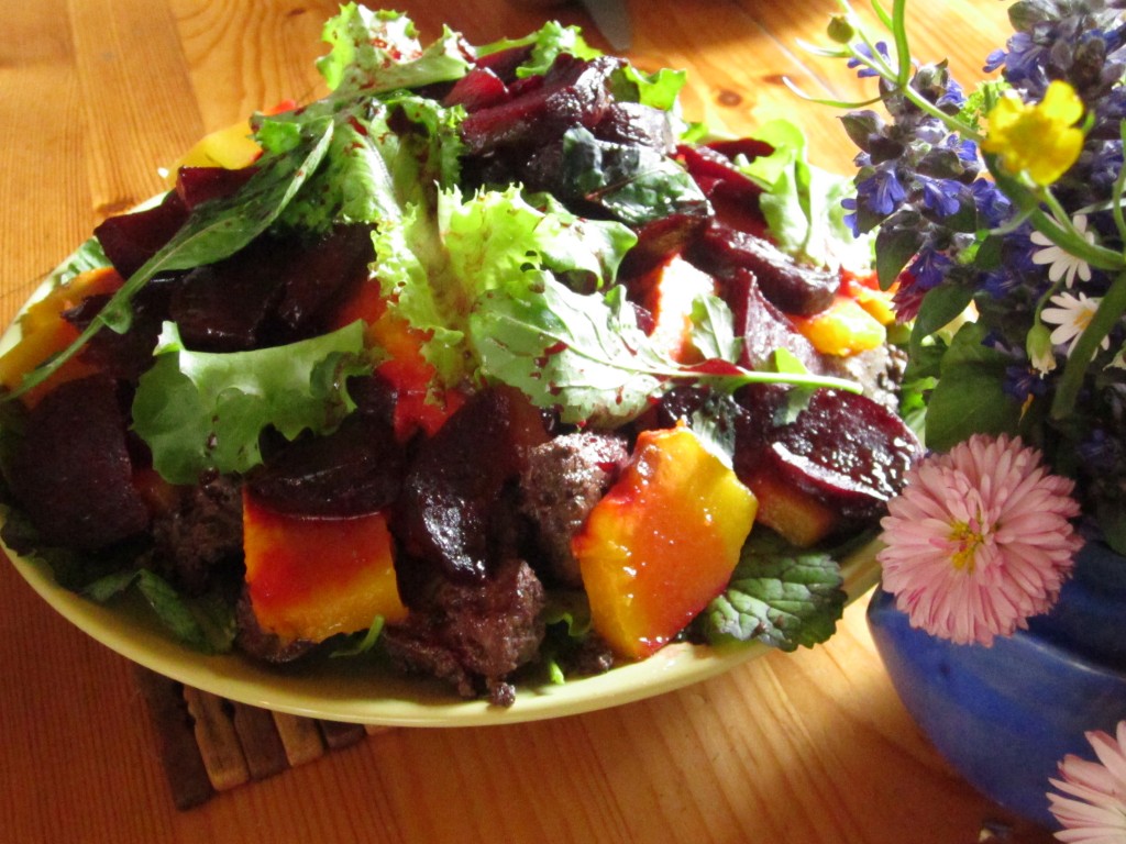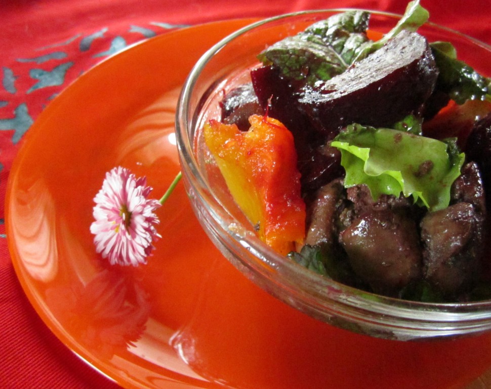 Также можно разложить салат с печёной тыквой, свёклой и куриной печенью порционно в небольшие прозрачные салатники. Получается очень симпатично!