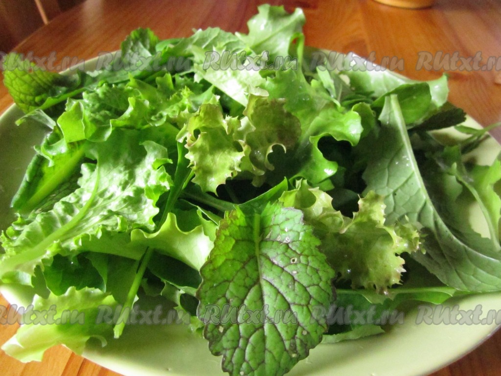 Осталось выложить составляющие нашего салата на блюдо. Сначала кладём слой салатных листьев (немного листиков отложим, чтобы положить их сверху).
