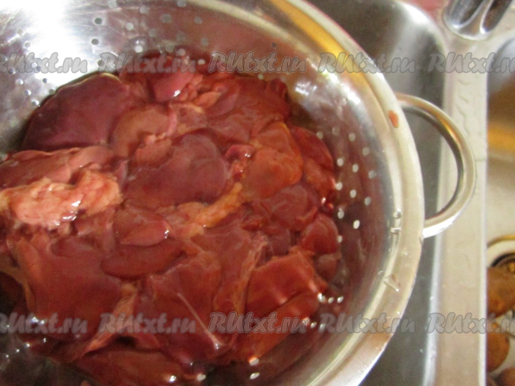 Приготовим куриную печень. Перед обжариванием, если есть лишняя жидкость, откинем печень на дуршлаг.