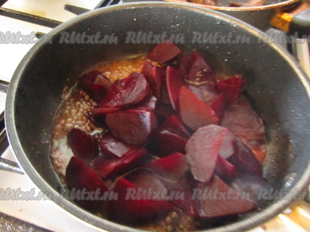 Выкладываем в соус нарезанную свёклу, перемешиваем и тушим несколько минут, чтобы она слегка замариновалась.