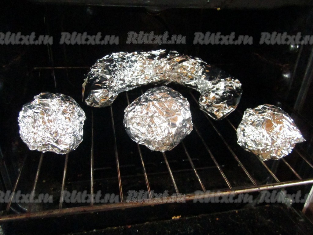 Завернём овощи по отдельности в пищевую фольгу. Тыкву предварительно нужно натереть со всех сторон солью. Запекаем овощи в духовке при температуре 180 градусов.