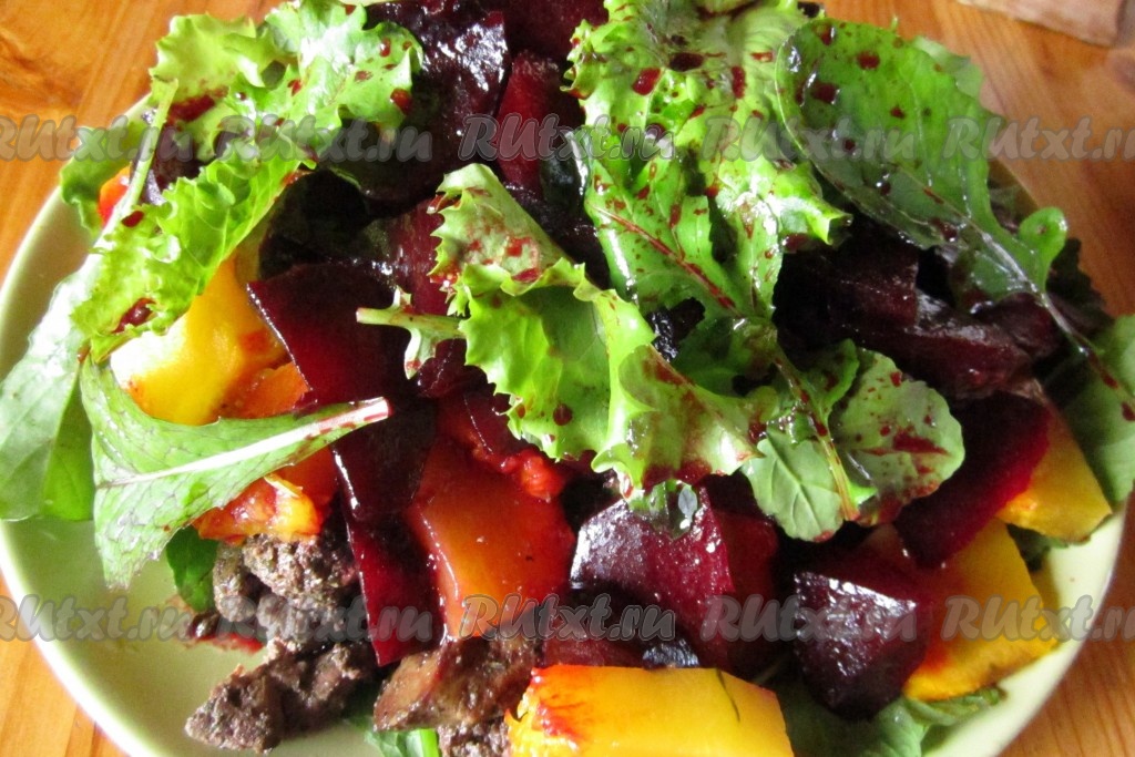 На листья салата выкладываем тёплую обжаренную печень. Сверху укладываем ломтики печёной тыквы.