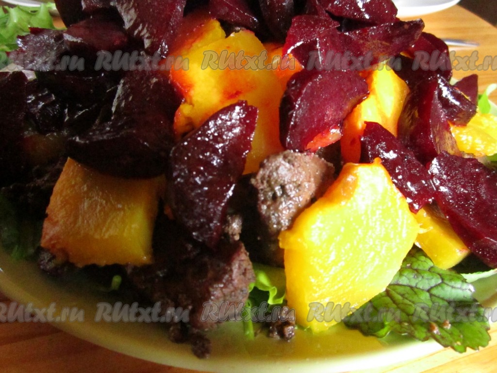 Поверх печёнки и тыквы раскладываем кусочки свёклы.