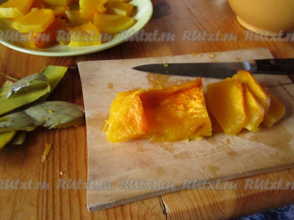 Печёную тыкву очищаем от кожуры и режем крупными ломтиками. Убираем в тёплое место, чтобы не остыла (например, в остывающую духовку).