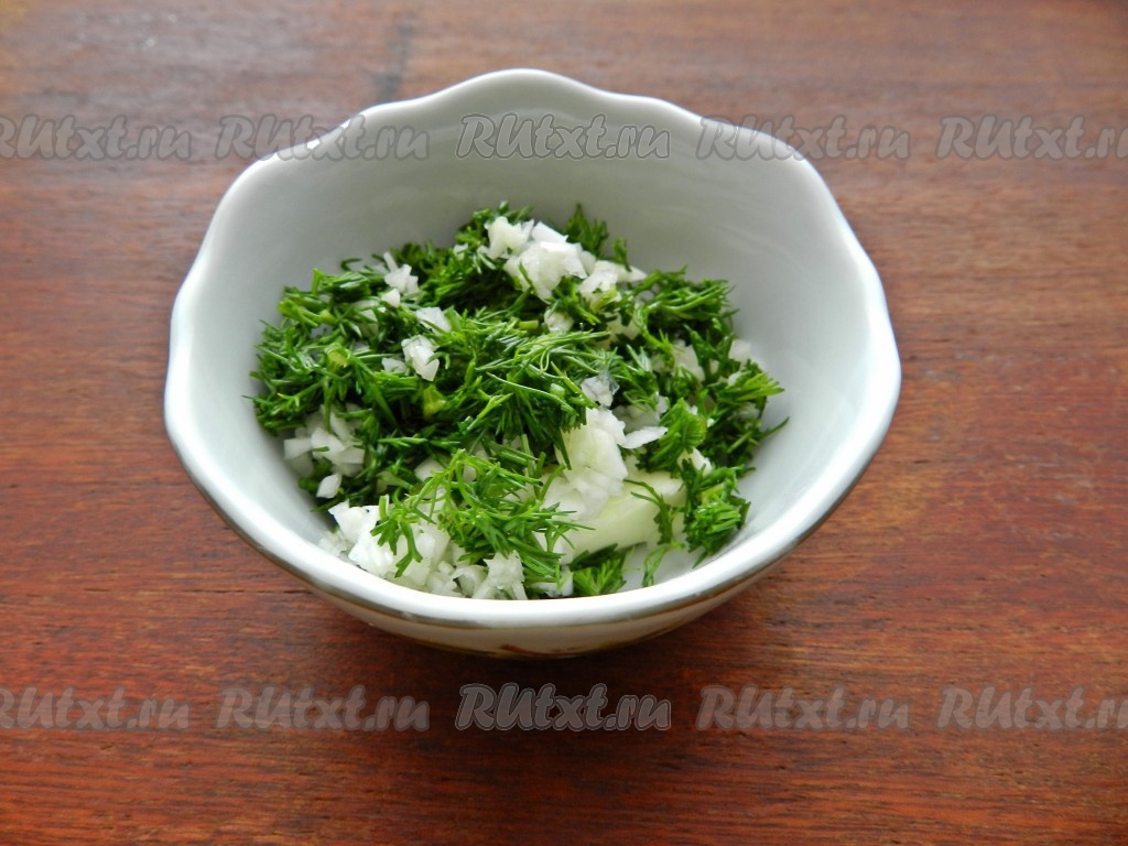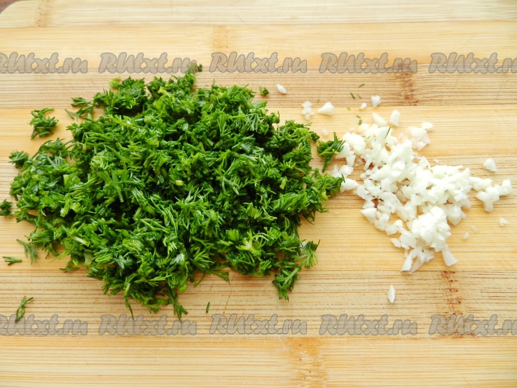 Укроп вымыть, обсушить и мелко нарезать. Молодой чеснок порубить ножом.