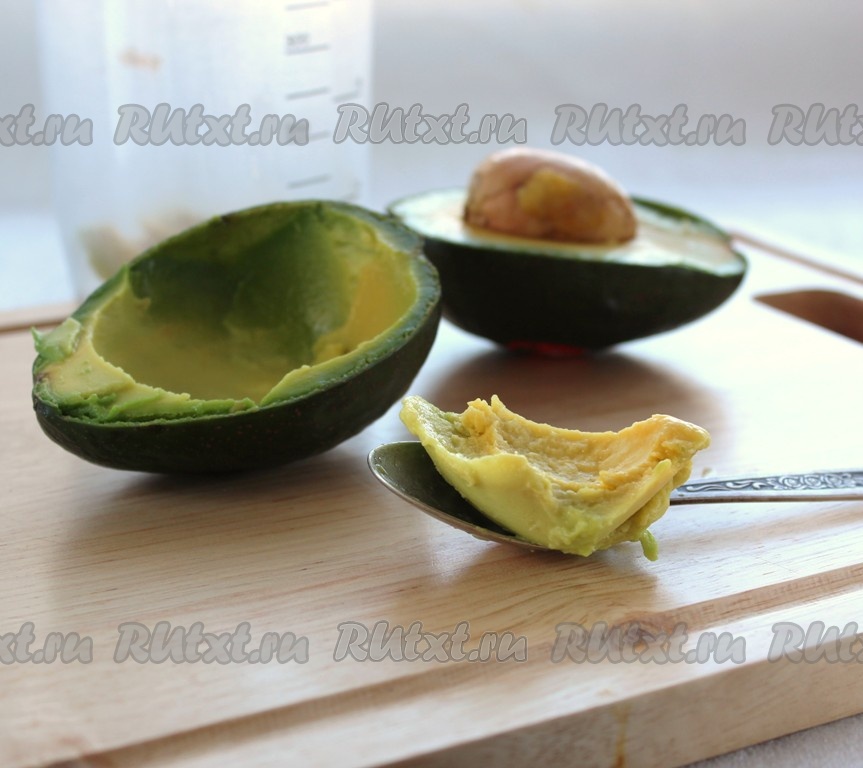 Авокадо для этого десерта надо брать спелый, чтобы мякоть легко отделялась от шкурки. Отделить мякоть авокадо от шкурки и поместить в чашу блендера, сбрызнуть немного лимонным соком.