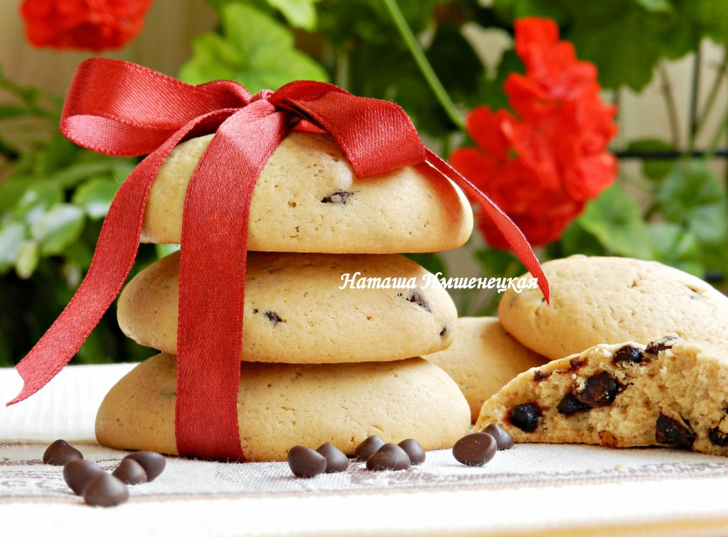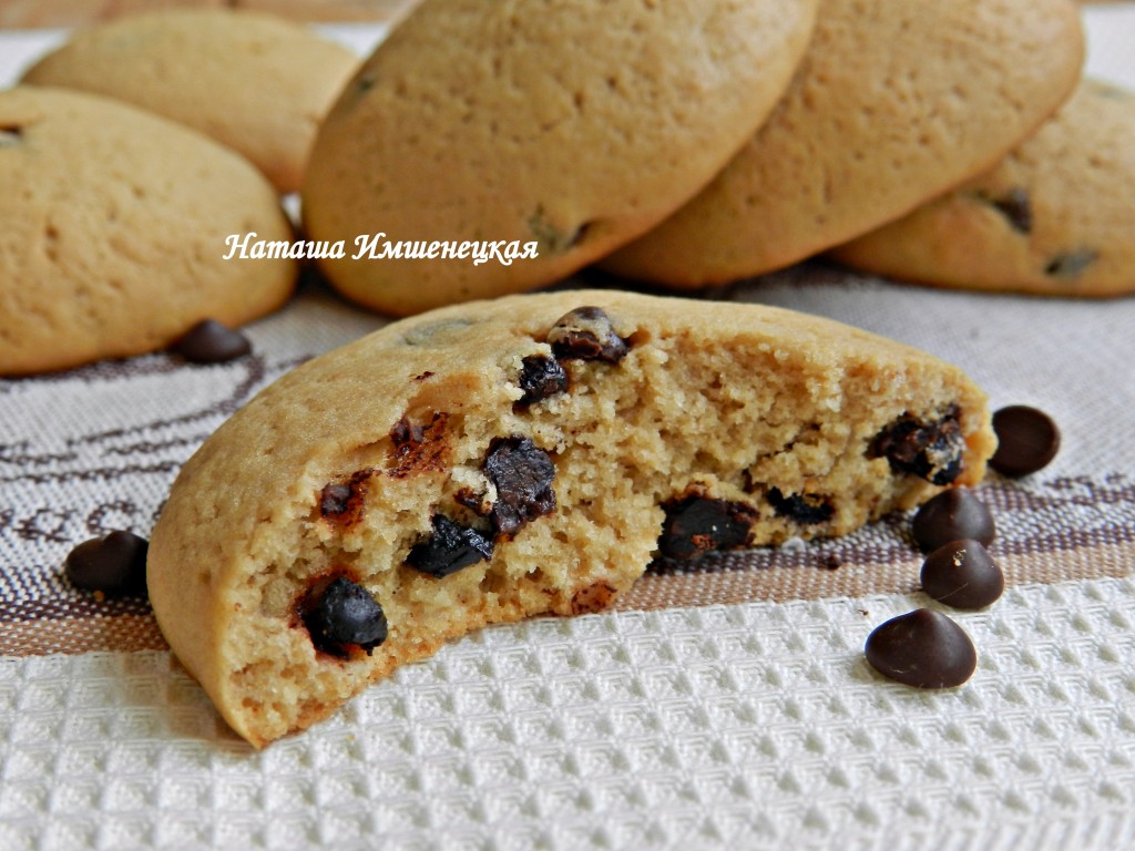Предлагаю к чаю приготовить мягкое, в меру хрупкое печенье с шоколадными каплями. Выпечка получается и вкусной, и ароматной, и очень аппетитной. Шоколадные капли в процессе выпекания не растекаются, поэтому печенье отлично смотрится в разломе.