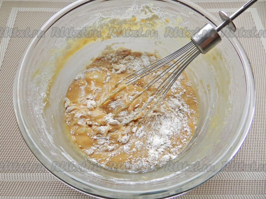 В получившуюся смесь всыпать разрыхлитель, начать частями добавлять муку, тщательно вмешивая её в тесто.