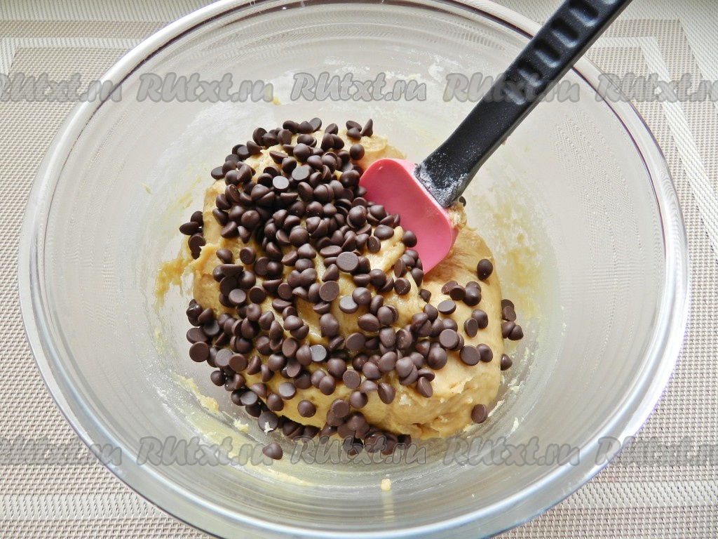 Тесто для печенья должно получиться густым, вязким. В тесто добавить шоколадные капли и хорошо перемешать.