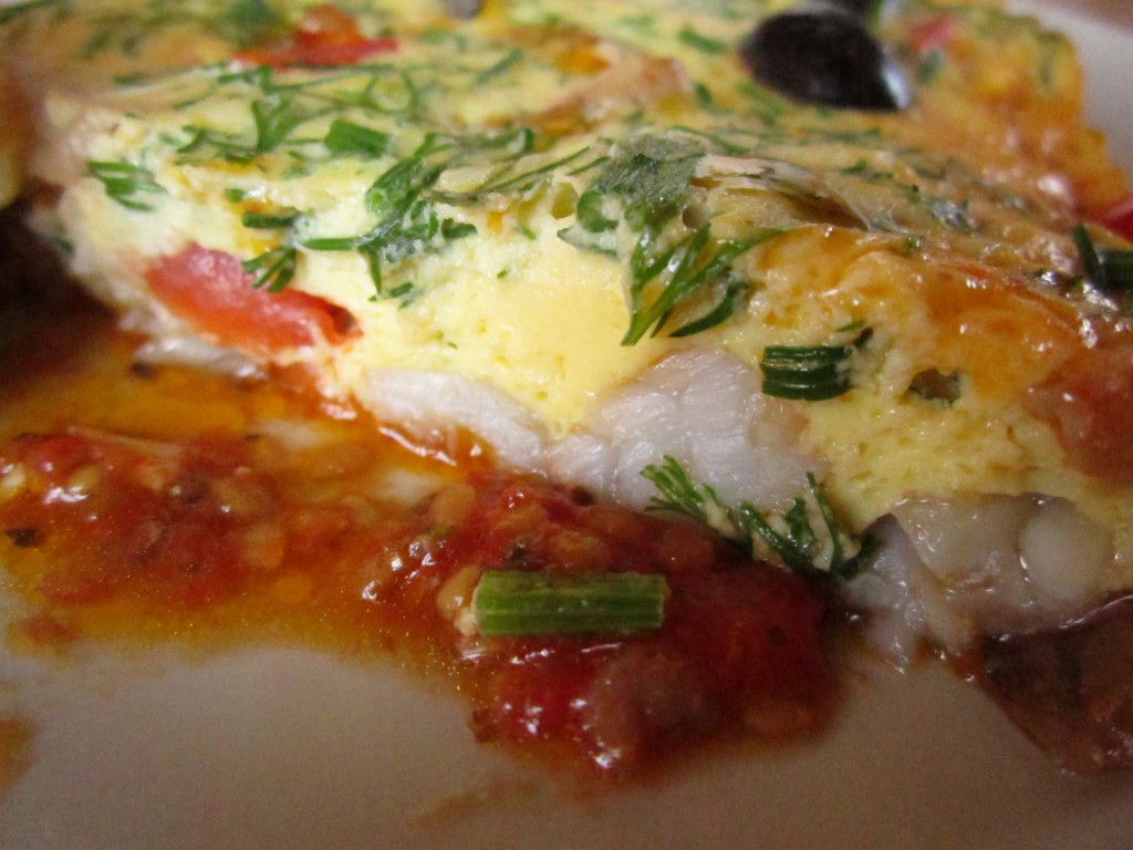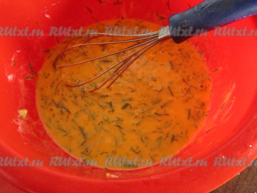 Пока рыба и овощи продолжают тушиться, смешаем, как для омлета, в глубокой миске яйца, сметану или молоко, измельчённые укроп и чеснок, также немного присолим.