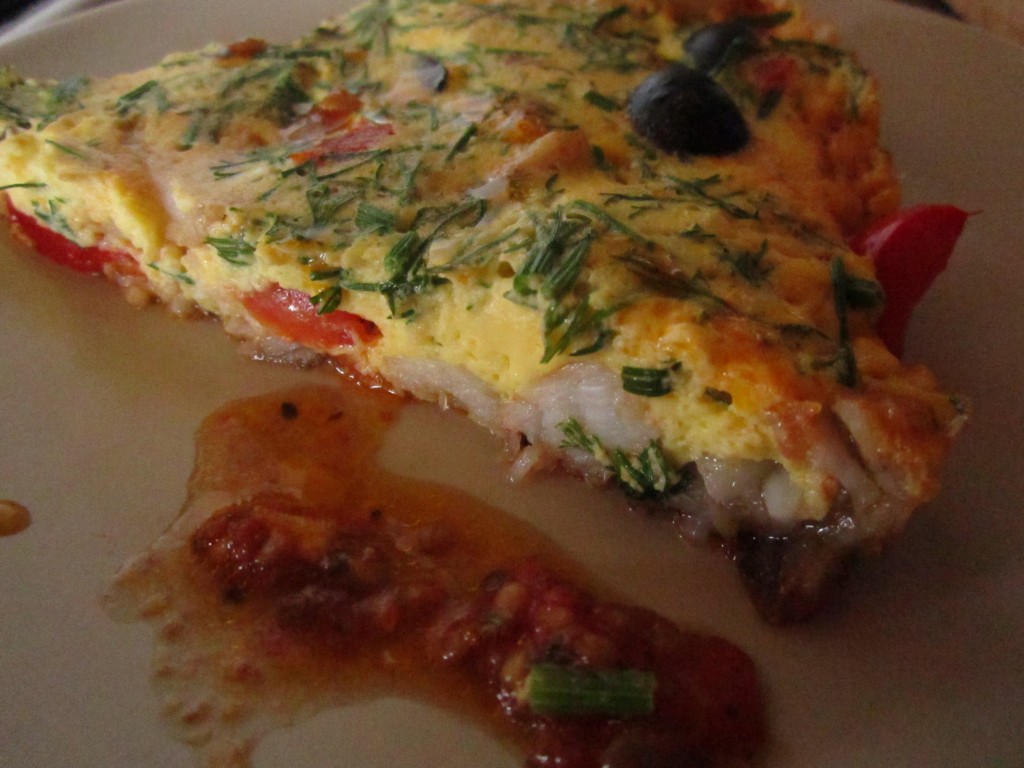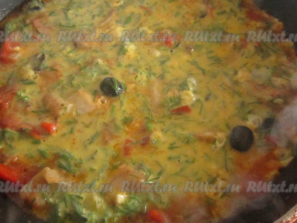 Вольём яичную смесь в сковороду с рыбой и овощами и равномерно распределим.