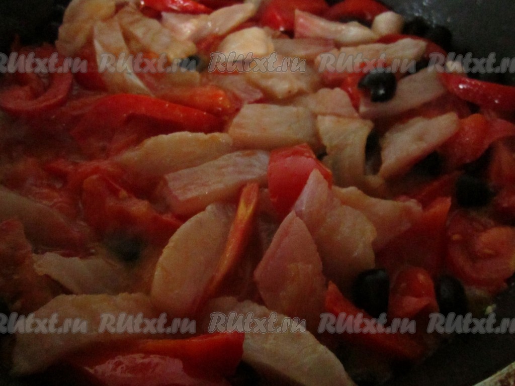 Добавьте рыбу в сковороду к овощам. Посолите по вкусу. По желанию можно добавить немного маслин без косточек.