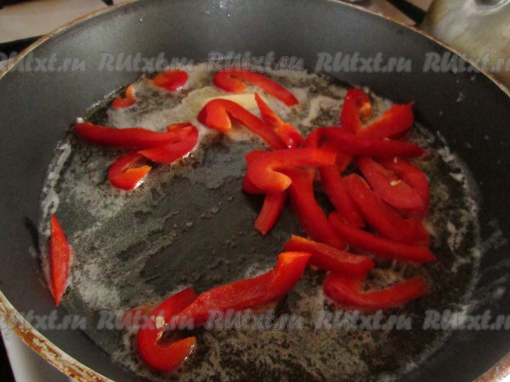 Крупно нарежьте половинку сладкого перца. Выложите кусочки в растопленное масло и немного потушите.