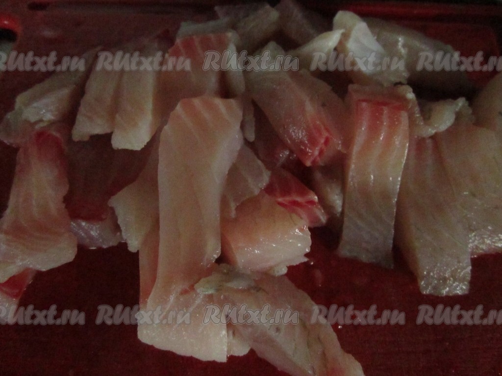 Пока овощи тушатся, порежьте рыбу кусочками, предварительно проверив, не остались ли в филе кости.
