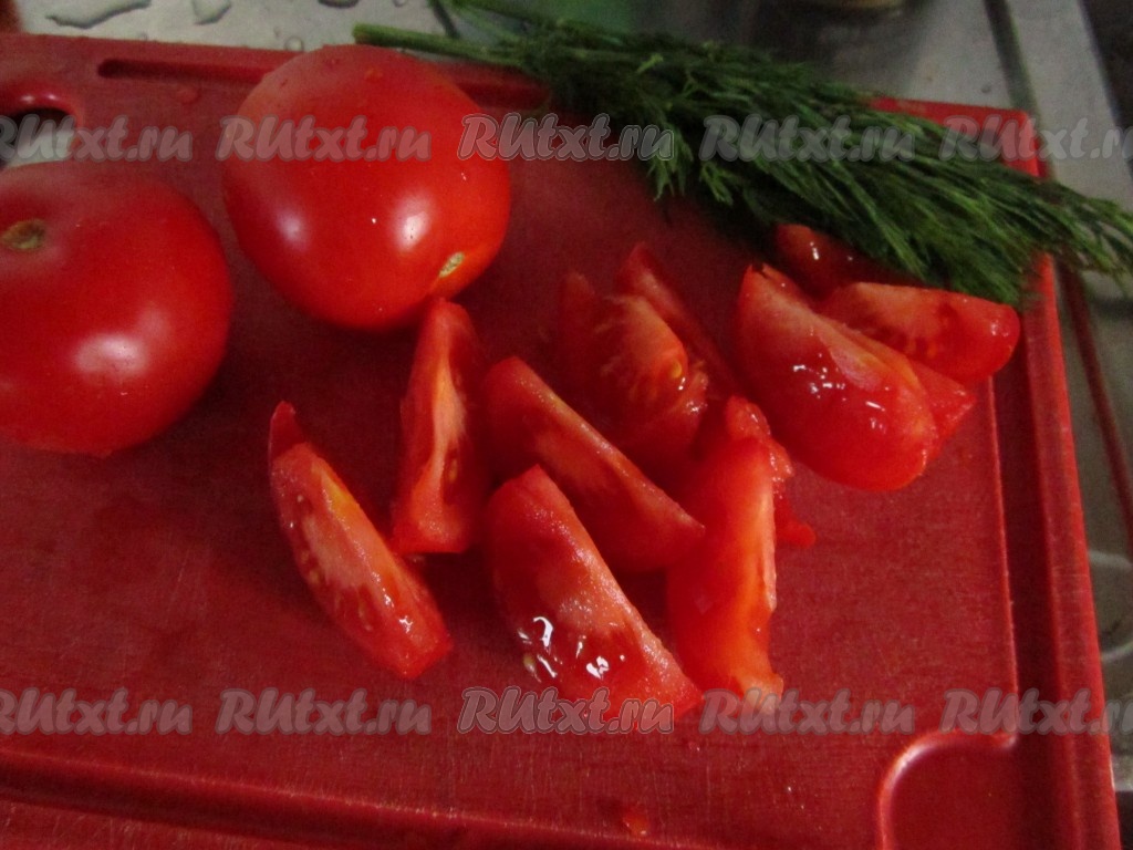 Тем временем нарежьте помидоры крупными дольками. Добавьте их в сковороду к перцу.