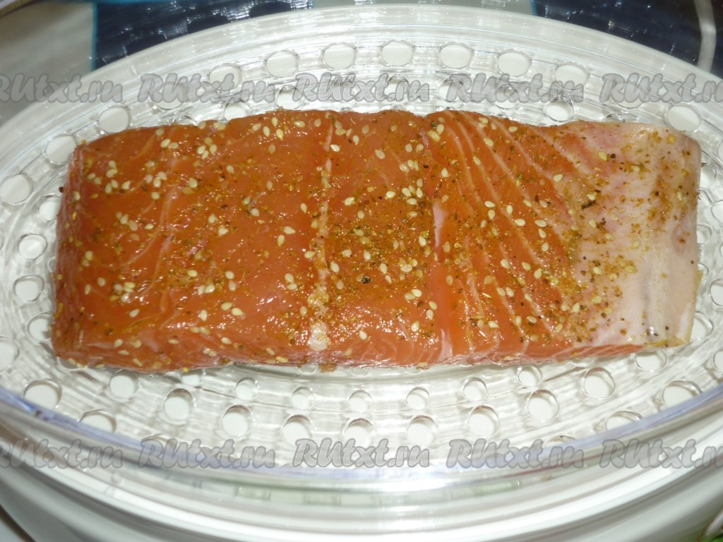 Выложить рыбу в пароварку, чтобы она не пристала, решетку можно немножко смазать оливковым или растительным маслом. Готовить 20-25 минут, в зависимости от куска рыбы.