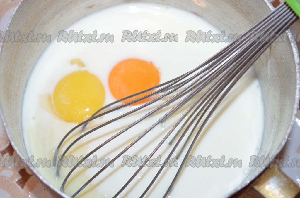 Для начала сварим заварной крем. Для этого в сотейник влить молоко, сгущенку, добавить желтки, растереть венчиком.