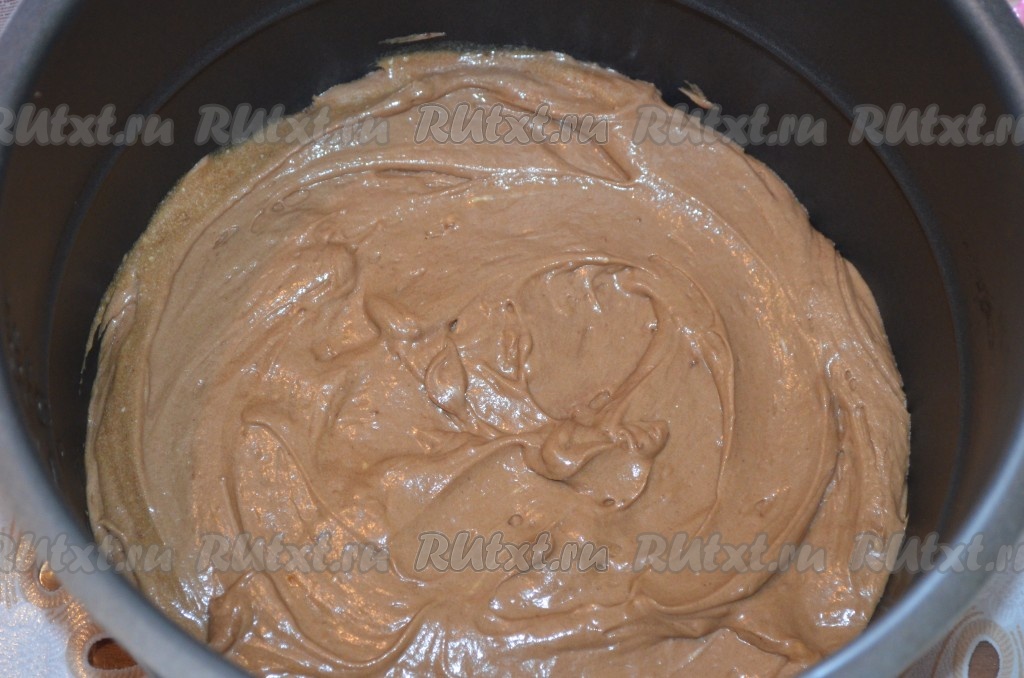 Выложить тесто в чашу мультиварки (или в смазанную форму), разровнять. Поставить режим мультиварки "Выпечка". Так как у меня мультиварка-скороварка, время выпечки 35 минут. Ориентируйтесь по своей мультиварке. После сигнала об окончании выпечки крышку не открывала еще 15 минут.