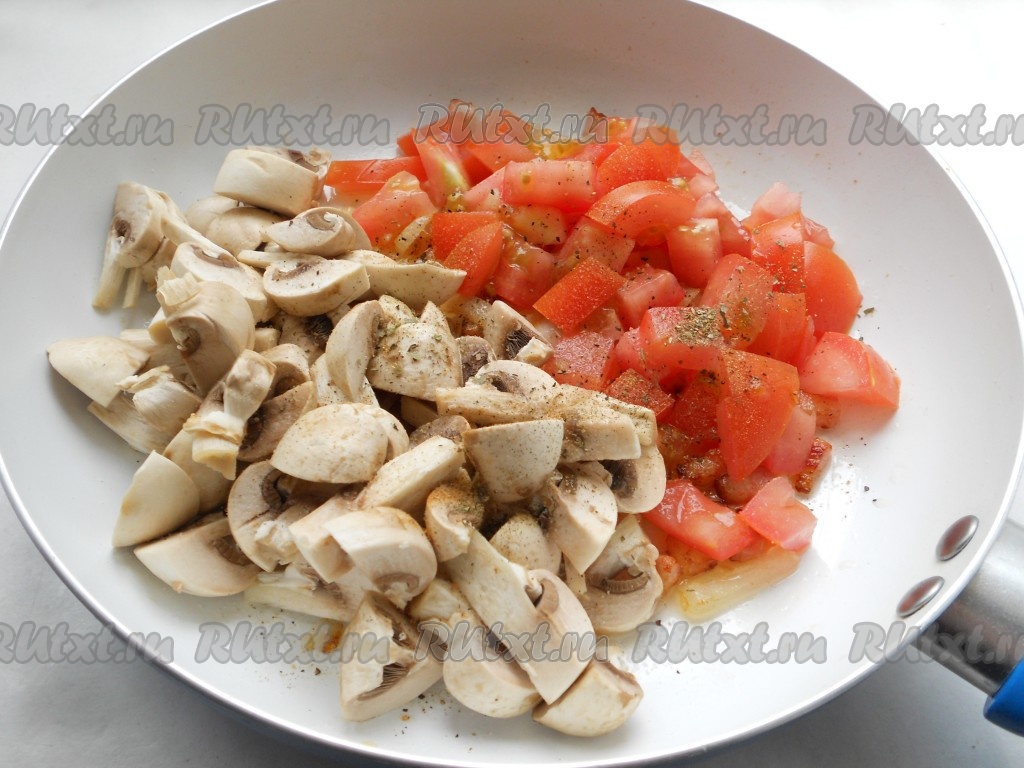 Помидоры порезать небольшими кубиками и добавить к луку вместе с грибами. Посолить, поперчить и посыпать итальянскими травами.