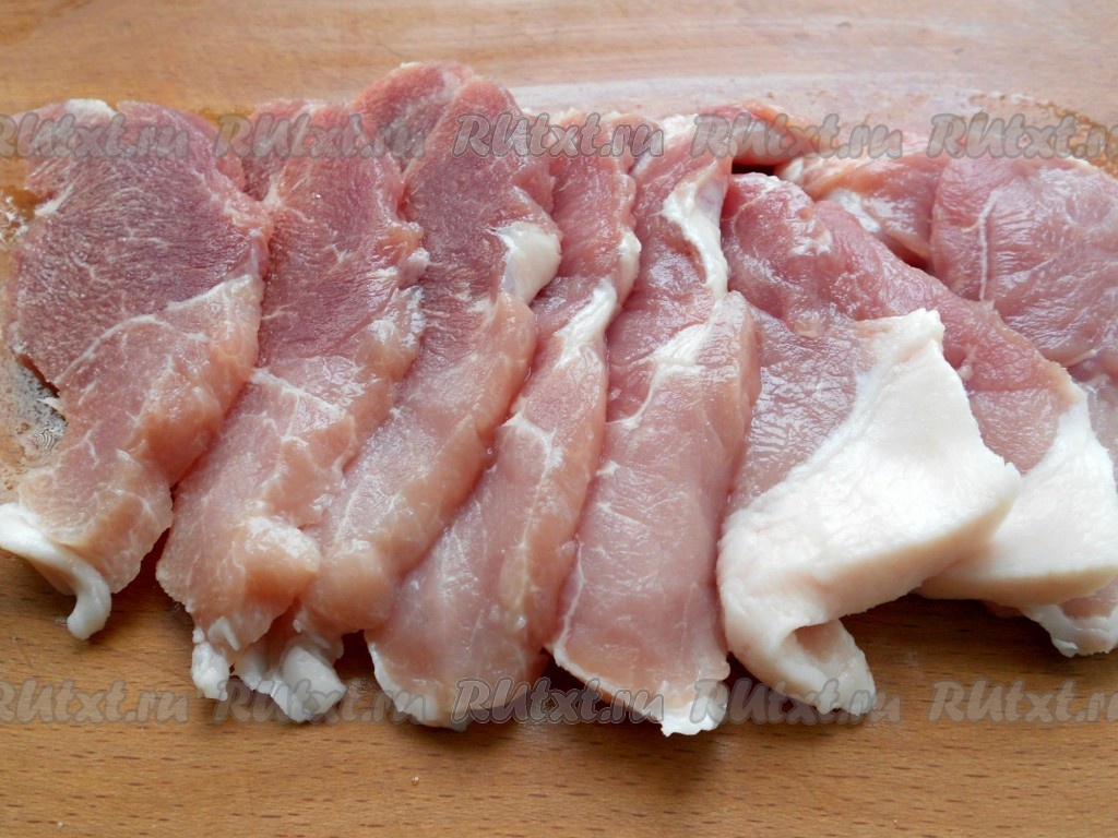 Свинину порезать тонкими, средней величины кусочками.