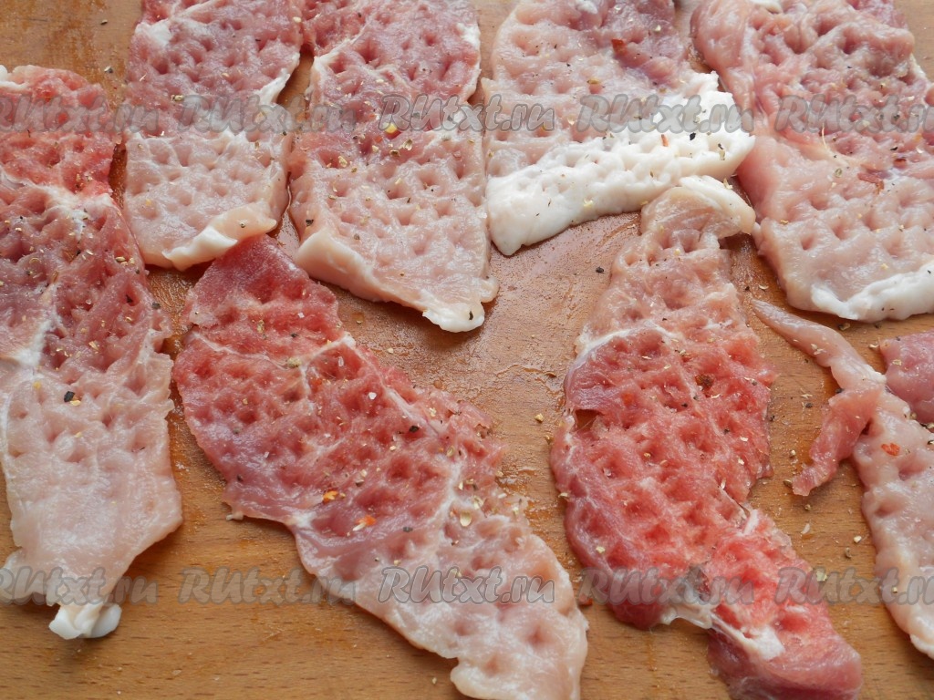 Отбить каждый кусочек молоточком. Посыпать специями для мяса.