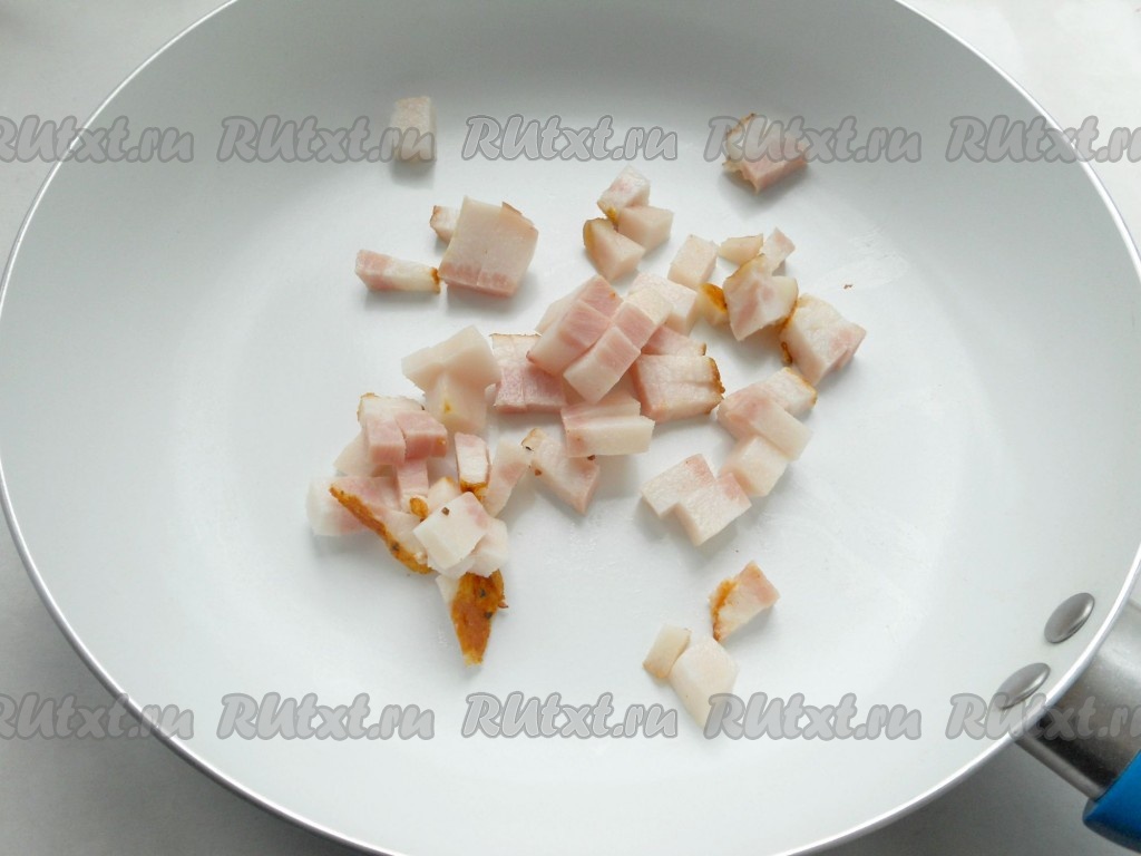 В чистую сковороду выложить порезанный мелким кубиком шпик.