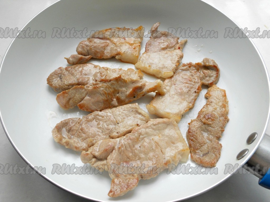 Мясо обжарить на растительном масле с двух сторон до небольшой румяной корочки, на довольно сильном огне (приблизительно по 3-4 минуты с каждой стороны). Выложить свинину на тарелку.