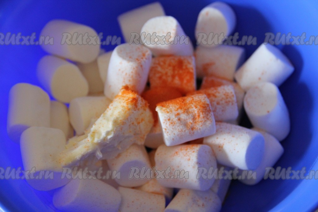 Берём достаточно объёмную посуду, которая подходит для приготовления блюд в микроволновке. В эту посуду перекладываем маршмеллоу, добавляем сливочное масло комнатной температуры, если нужно, всыпаем краситель.
