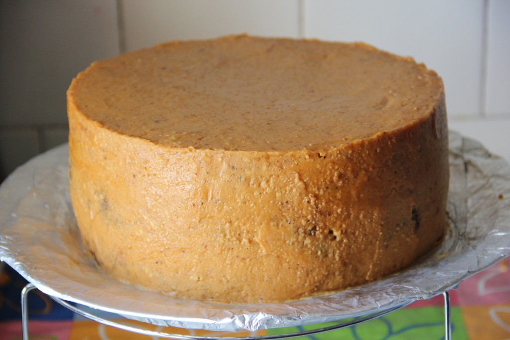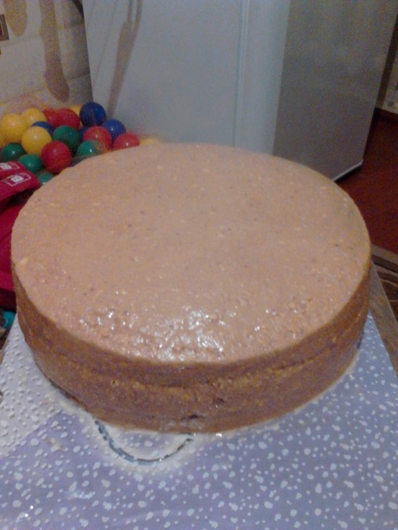 С помощью шпателя, тортовой лопатки или ножа наносим наш крем на торт. Этим кремом прекрасно можно выровнять вмятины или неровности. Когда весь крем использован и распределен по торту, приступим к выравниванию поверхности.