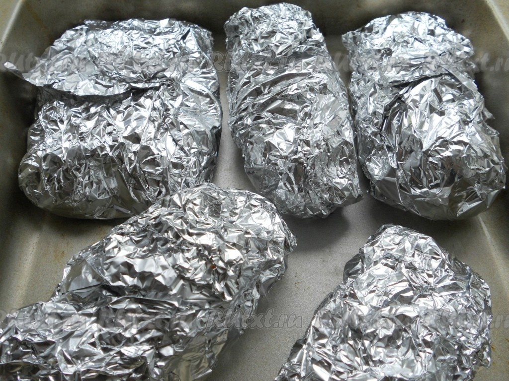 Завернуть тщательно фольгу. Таким образом подготовить весь картофель. Поместить его на противень.