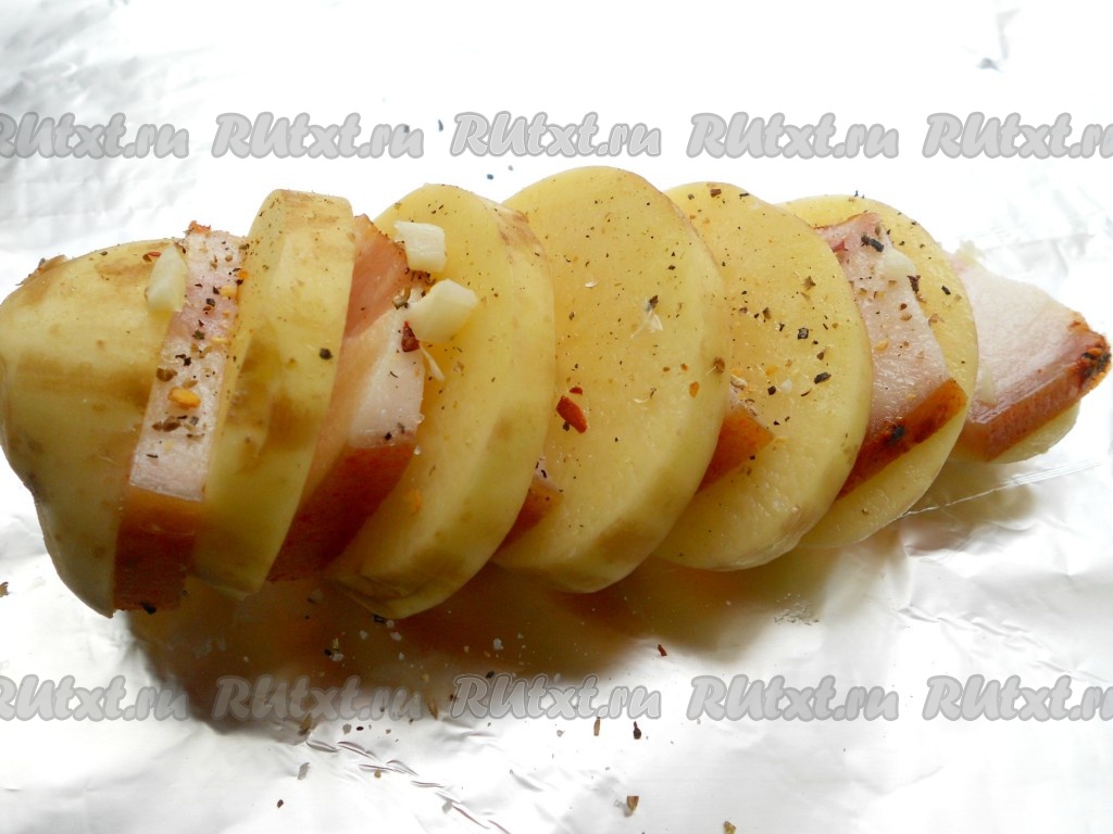 Каждую порезанную картофелину поместить на лист фольги, каждый кусочек сала выкладывать между кружочками картофеля. Посолить хорошо (если сало соленое - не переборщите с солью), посыпать смесью перцев и порезанным мелко чесноком. Полить сверху каждую картофелину 0,5 чайной ложкой растительного масла.