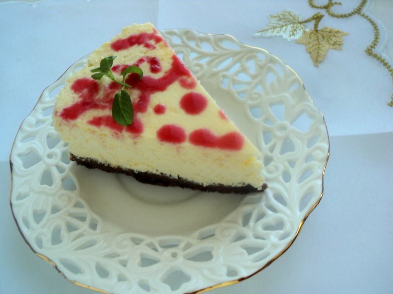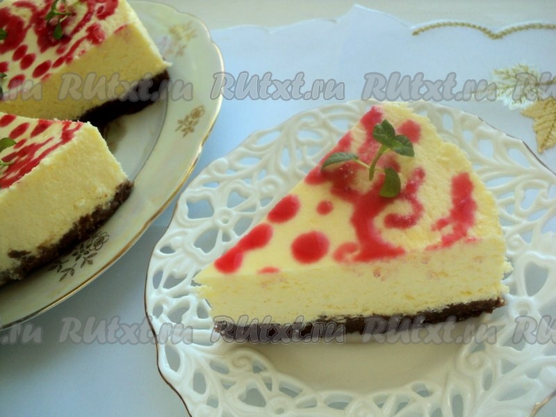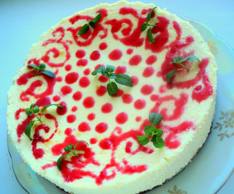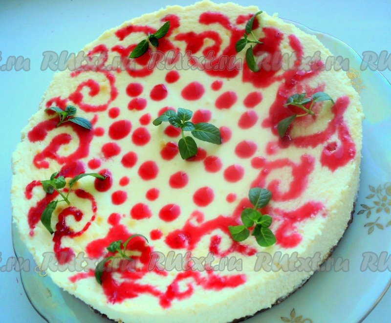 Перед подачей по желанию украсить чизкейк узорами из малинового джема и листиками мяты.