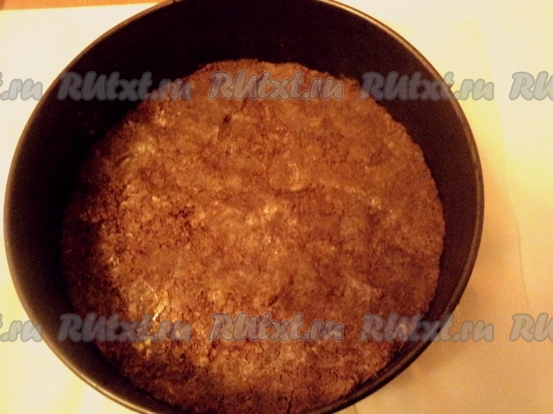 Дно формы (диаметр 20 см) застелить бумагой для выпечки, смазать маслом. Выложить крошку из печенья, уплотнить. Выпекать в духовке при температуре 180 градусов 10 минут. Затем охладить основу в форме.