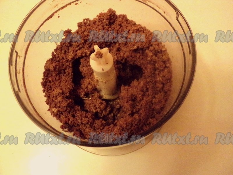Печенье поломать на кусочки и измельчить в блендере в крошку. Добавить мягкое сливочное масло, желток и хорошо размешать.