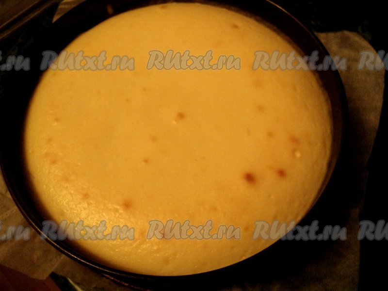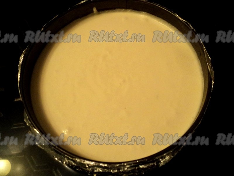 Вылить творожную массу в форму. Форму предварительно обернуть несколькими слоями фольги. Поставить форму с чизкейком в глубокий поддон, налить на 1/3 высоты формы воды. Выпекать при температуре 200 градусов 25 минут, затем температуру снизить до 170 градусов и печь еще 20 минут. Края готового чизкейка должны немного схватиться, а серединка подрагивать.