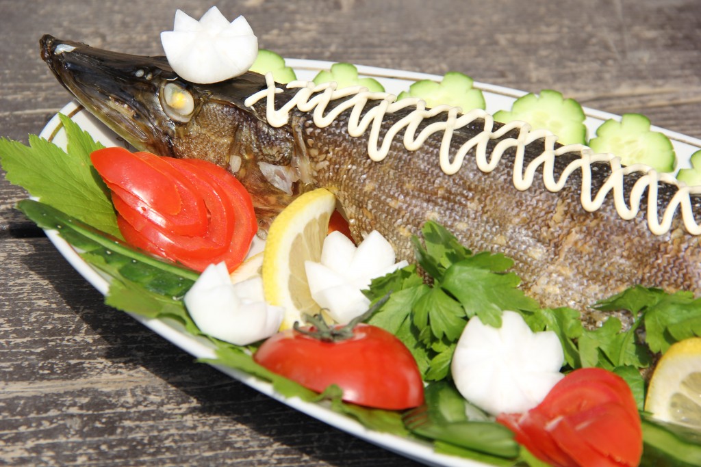 Готовую рыбу выложить на блюдо, украсить по желанию. Подать щуку с овощами гриль, свежими овощами или любым другим гарниром.