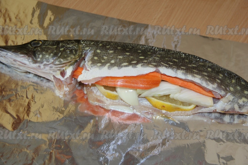 Смыть с рыбы излишки соли (рыба взяла соли ровно столько, сколько надо!). Выложить щуку на фольгу, брюхо рыбы набить овощами (лук и морковь крупно нарезать, лимон нарезать на дольки).