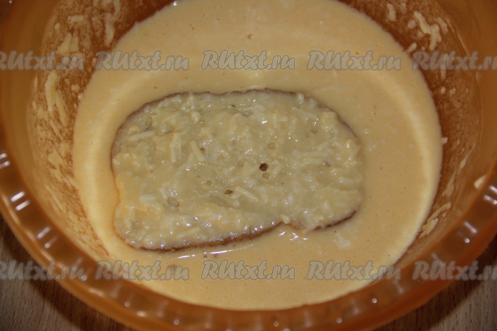 Обмакнуть кусочки хлеба в сырную смесь с двух сторон.