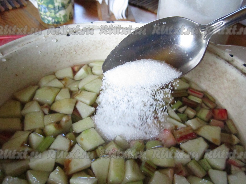 Выкладываем ревень и яблоки в кастрюлю и заливаем 5-ю стаканами холодной воды. Добавляем сахар.