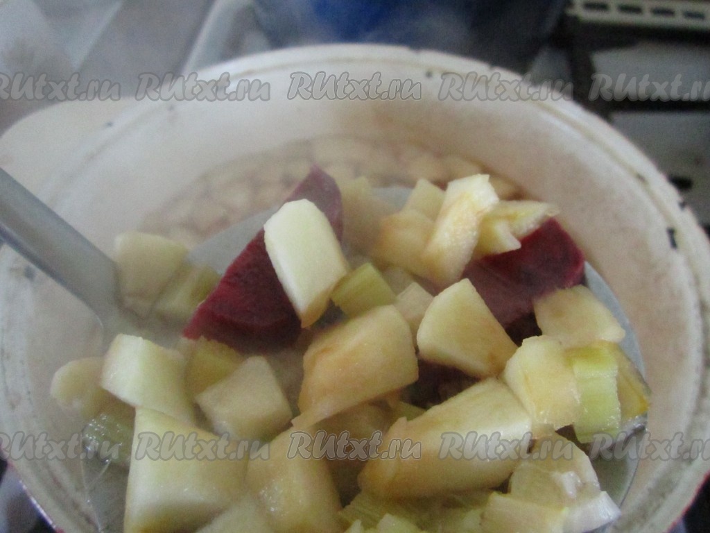 После закипания варим свёклу с ревенём и яблоками около 1/2 минуты, затем вылавливаем свеклу, чтобы она не отдала киселю также и вкус!