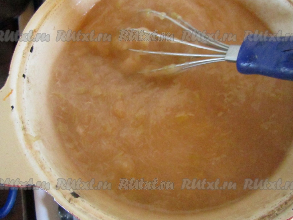 Быстро перемешивая, тонкой струйкой вливаем крахмал с водой в кастрюлю с кипящей фруктовой массой. При постоянном помешивании снова доводим кисель до кипения и варим ёще 1 минуту.
