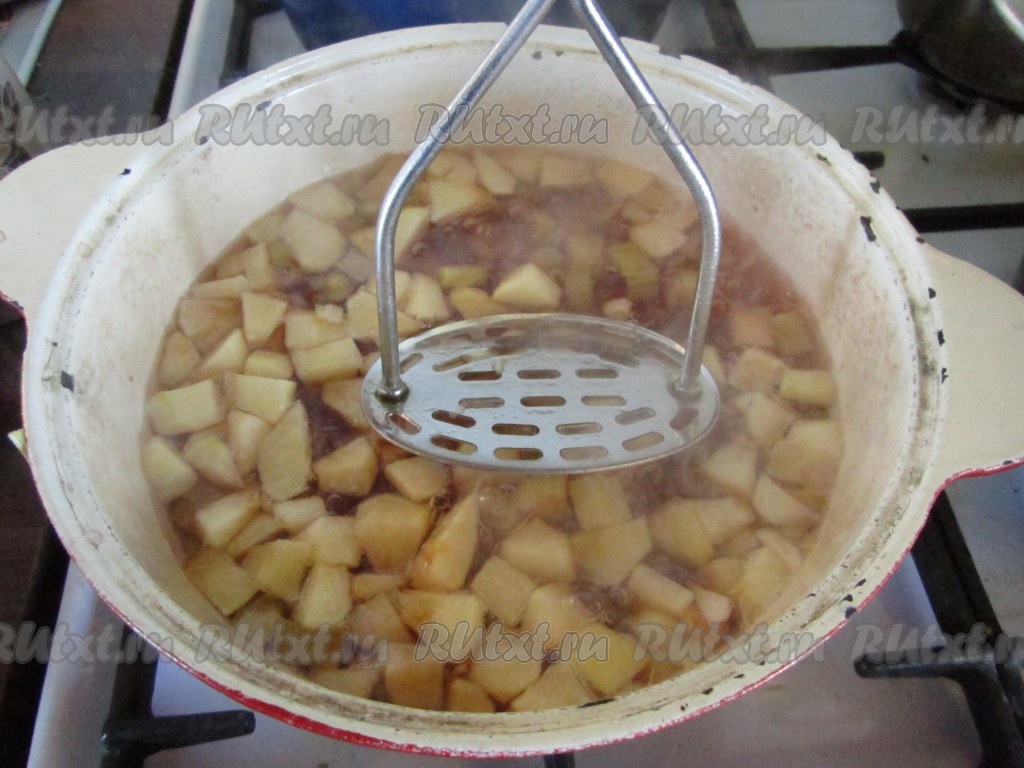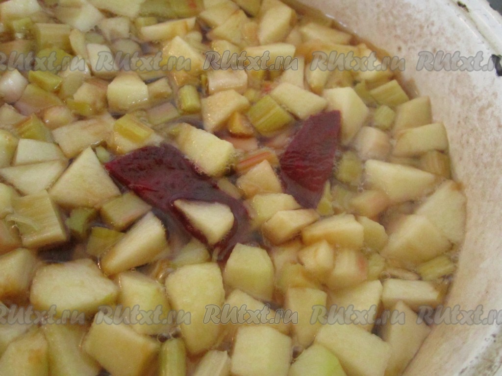 Варим ревень и яблоки в сиропе на небольшом огне около 10 минут до размягчения. Затем слегка раздавим кусочки картофельной толкушкой.