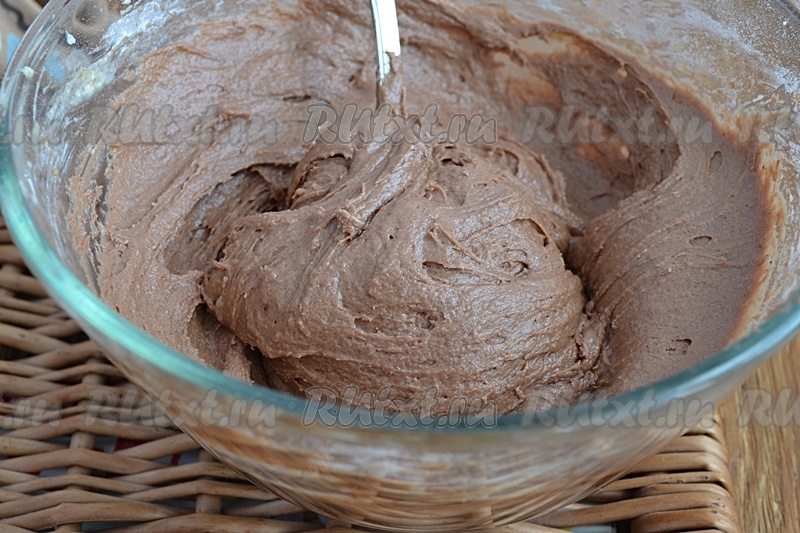 Яйца взбить с сахаром до побеления массы (это можно сделать миксером или венчиком). Добавить сметану и перемешать до однородности. В массу всыпать разрыхлитель и какао, перемешать. Затем постепенно начать добавлять муку. Замешиваем тесто ложкой, оно должно получиться, как достаточно густая сметана. Муки может потребоваться немного больше или меньше (многое зависит от размера яиц и жирности сметаны), главное - ориентируйтесь на консистенцию замешиваемого теста.