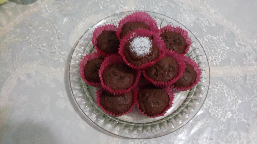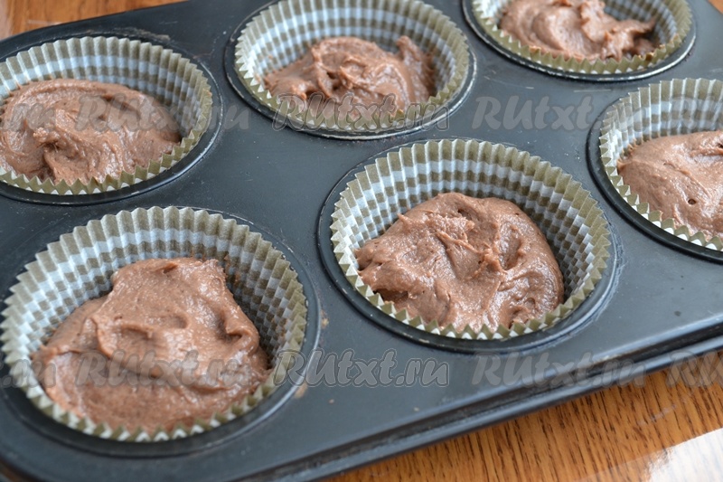 Тесто разложить по формочкам для маффинов, заполняя их на 2/3 объёма. У меня были специальные бумажные вкладыши для выпечки маффинов, поэтому я не смазывала формочки маслом. Если форма металлическая, тогда её нужно обязательно перед выкладыванием теста смазать маслом. Шоколадные маффины, замешанные на сметане, нужно выпекать в разогретой до 180 градусов духовке около 25 минут.