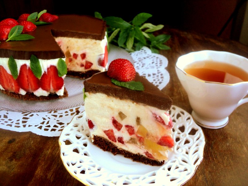 Нежный и вкусный торт "Клубника в шоколаде" можно подавать к столу.