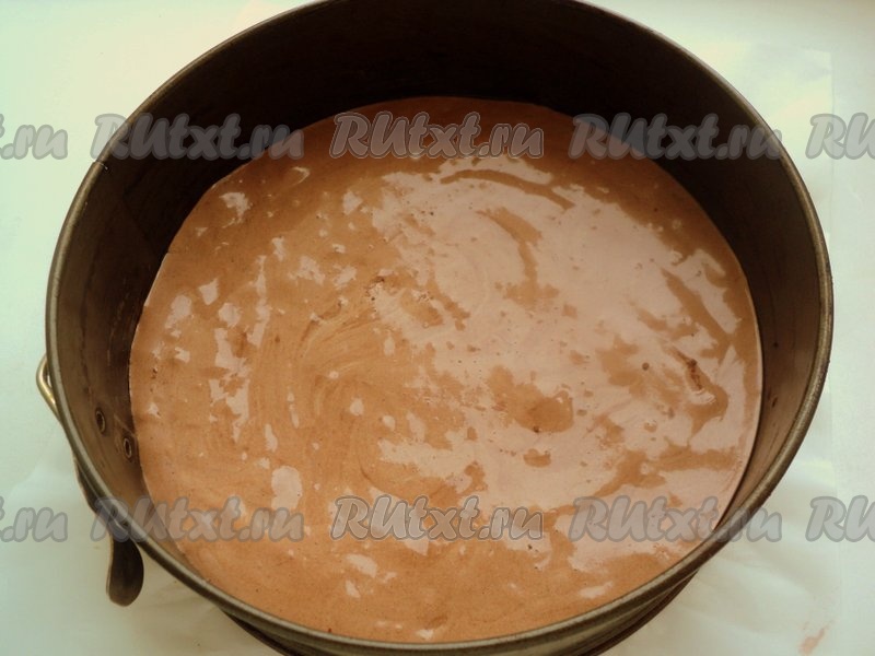 Снять яичную смесь с водяной бани и осторожно добавить смесь муки с какао и разрыхлителем, осторожно  перемешать до однородной массы. Дно формы для выпечки (диаметр 20 см) застелить бумагой для выпечки, смазать маслом (бока формы не смазывать), вылить тесто. Чтобы бисквит при выпечке был ровный, крутануть несколько раз форму с тестом по часовой стрелке.
